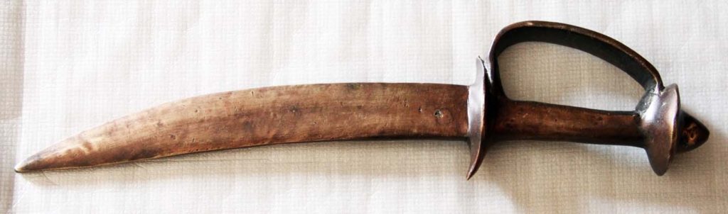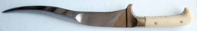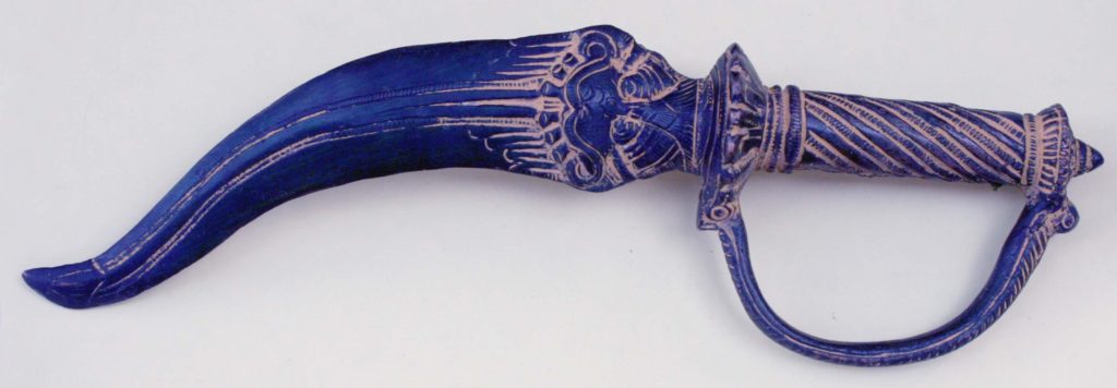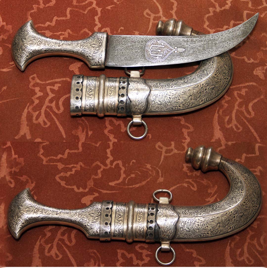 The Jambiya dagger has cultural origins in Yemen going back nearly 3000 years. With a T-shaped handle made from horns or animal bones and decorated with gold and other precious metals, it is famous throughout the Arab world and areas wherever Arab influence could penetrate historically – from Turkey to the Balkans and from Spain to India. Generally having a ‘J’ shaped curved double-edged blade, it also travelled to other cultures in Persia and the Ottoman Empire albeit with some alterations to the blade, hilt and scabbard. The Jambiya is tucked inside a sheath called Aseeb, which is made of wood and covered with brown or white leather, or decorated metal.