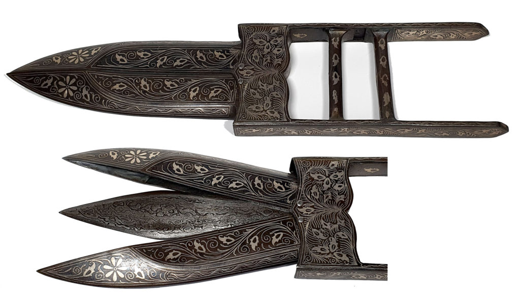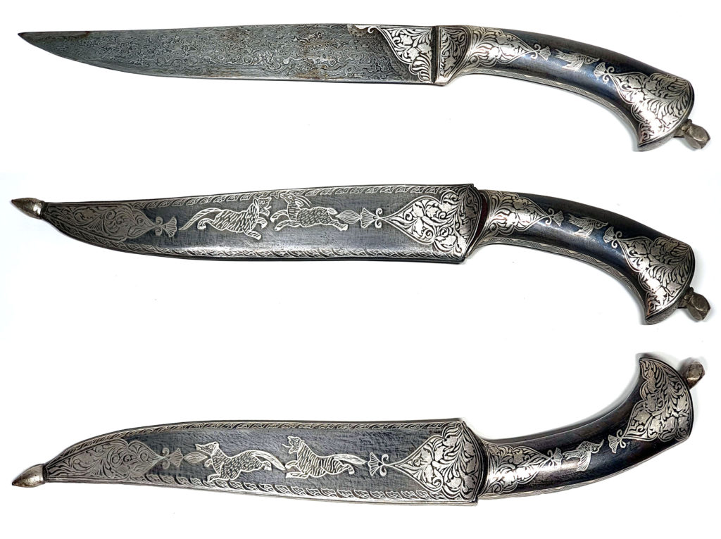 The Pesh Kabz dagger carries a rich history and is a weapon with a distinctive shape that originated in the Indian subcontinent, particularly in regions that are now part of India, Pakistan, and Afghanistan. It is closely linked to the martial cultures of the Mughal Empire and the Persian influence in the region. It emerged around the 17th century when the Indian subcontinent was undergoing significant military activity and was designed to be a piercing weapon capable of penetrating the armor of the time including chain mail and light armour. The Pesh Kabz has a robust thick blade that tapers to a very sharp point, and the blade’s spine is usually thick, providing the strength and rigidity needed to pierce armor. The blade often features in both single-edged and double-edged variants. The handle is designed to provide a secure grip that is essential for thrusting action and is typically crafted from bone, ivory, horn, or wood and is usually intricately carved or decorated with precious metals including gold filigree work. The handle is also full tang which means that the blade extends through the handle, enhancing the weapon’s durability and strength. The Pesh Kabz was favoured by soldiers and warriors as a sidearm for its effectiveness in close combat and its ability to pierce armour. It was also a symbol of status for the wealthy and nobility holding a place of significance in the cultural heritage of the regions where it was used; appearing in various historical texts, artworks, and folklore, symbolizing bravery and martial prowess.