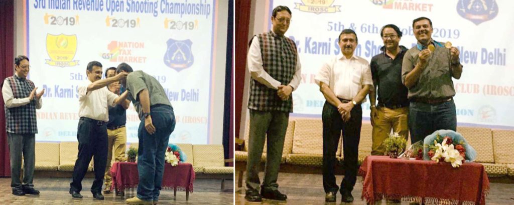 2 Gold Medals in 10m Pistol and 50m Pistol events at the Indian Revenue Officers Shooting Championship 2019. Receiving medals from Dr. John Joseph, Member – CBIC, Govt of India, and Shri CS Mishra, Addl. Commissioner, in the august presence of Shri Jaspal Rana, Padmashree, Olympian and Chief Coach of the Indian Junior Pistol Team.