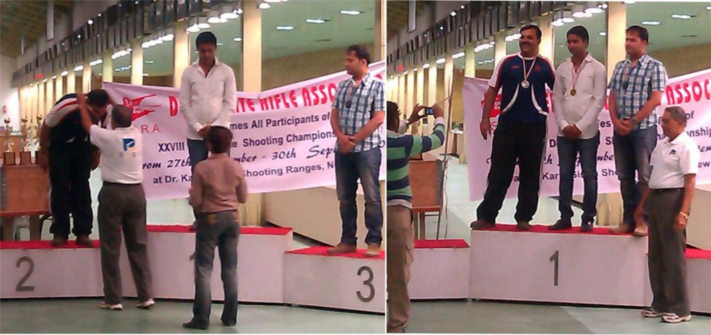 Gold Medal in 10m Pistol event at the South Delhi District Open Shooting Competition 2018. Receiving medal from Shri Asif Ali, IPS, Deputy Commissioner of Police and Insp. Azam Khan, SHO & a national medallist shooter.